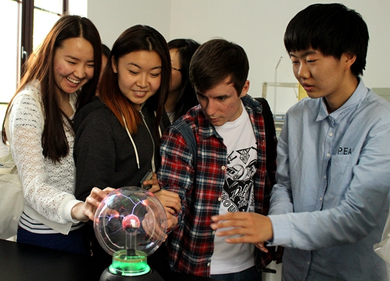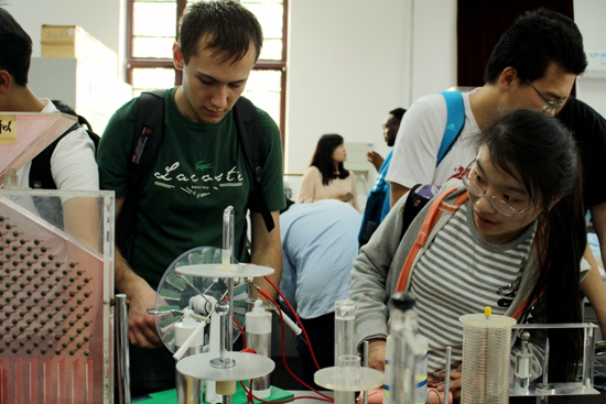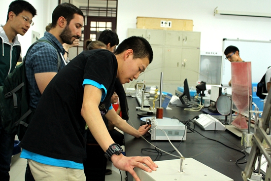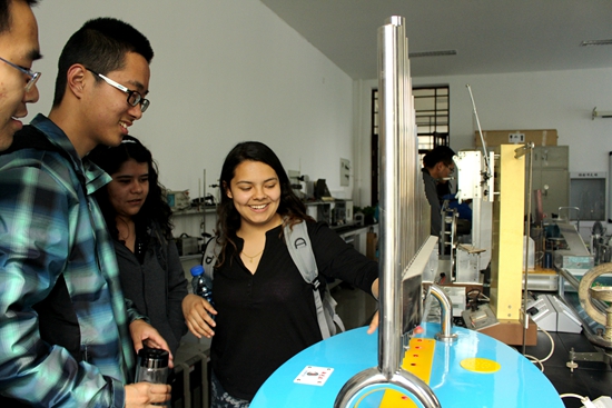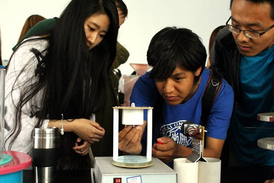 相聚在物理学院,分享各自的学习状态,交流各国的教育理念和文化习俗。留学生们走进演示物理实验室,体验了电磁炮、静电跳球、磁悬浮陀螺、进动仪等趣味物