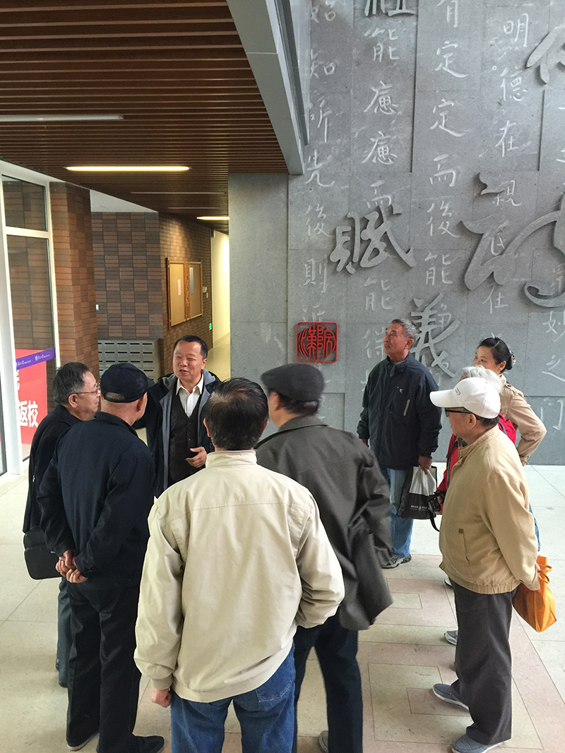 退休老教师们首先来到津南校区汉院新楼参观,学院负责老师对具有中华传统文化特色的“文字墙”进行详尽的讲解。