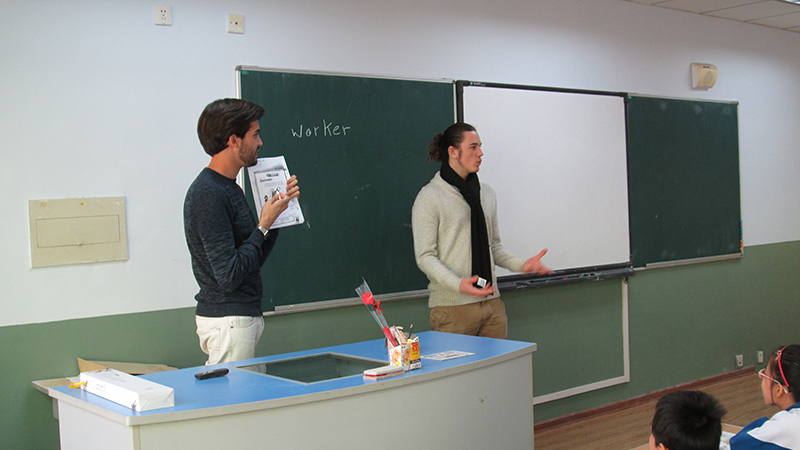 在学校老师的引领和讲解中,留学生们先后走进了历史课堂,语文课堂,生物课堂和美术课堂,在亲身体验中进一步加深了对中国教育和中国学生的认知。活动过程中,留学生们不仅亲自尝试了给中国学生设计校服,了解了交汇东西方文明的丝绸之路,还用地道的英语为中小学生介绍了万圣节和英语冠词的用法。他们幽默风趣的表情,丰富灵活的肢体语言给中国学生留下了深刻的印象。一些来自日本、韩国和俄罗斯的留学生还教会中学生说简单的本国语言。大家的交流非常融洽。