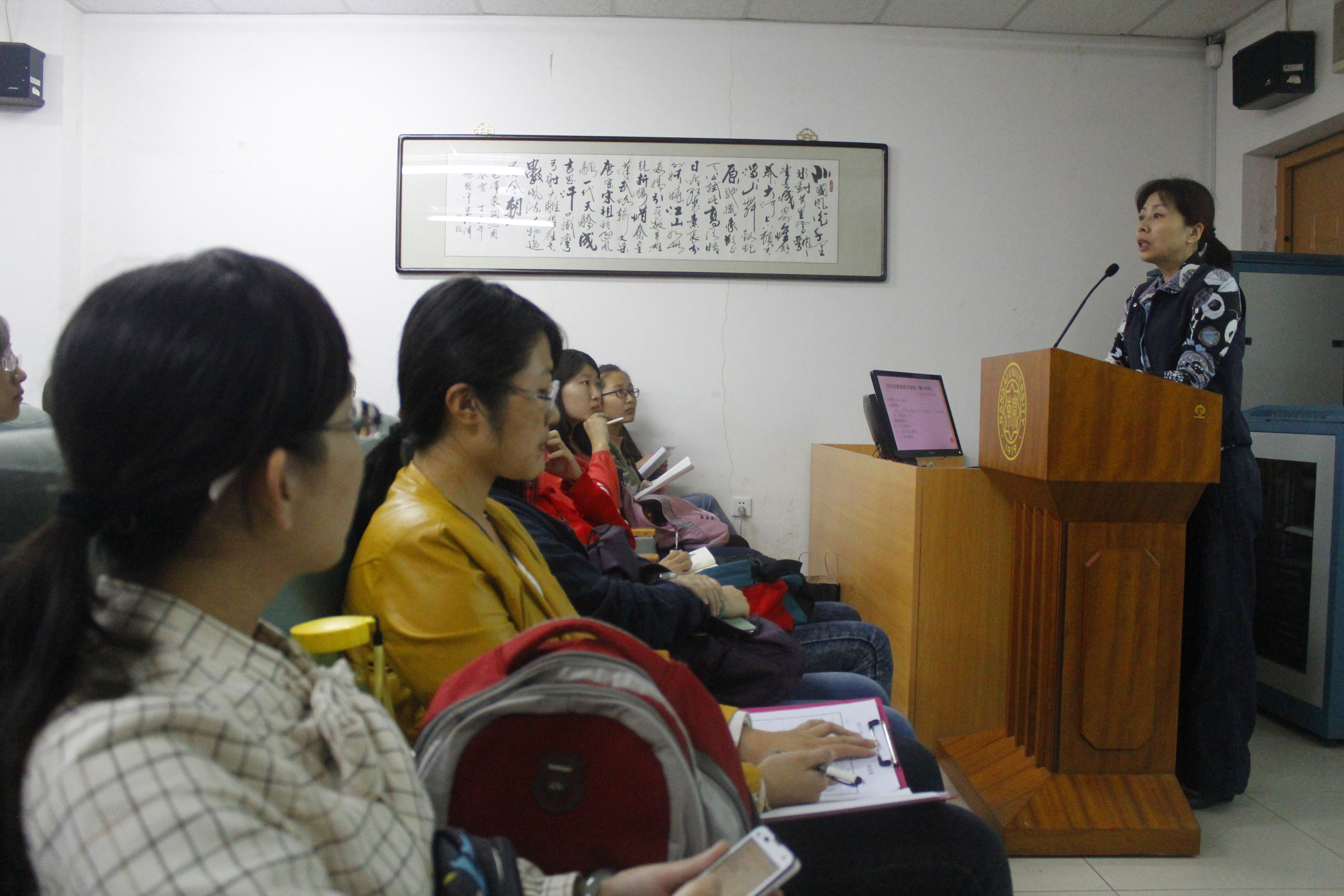 首先,关键老师介绍了汉办选拔外派志愿者的面试流程和主要组成部分。面试主要由心理测试、综合能力测试和外语能力测试三个部分轮流穿插进行。其中综合能力测试包括专业知识测试和跨文化交际问题测试,以及部分中华才艺特长展示等内容。其中综合能力测试和外语能力测试主要考察平时的积累。同时,她也指出一些对于面试成败也起到举足轻重作用的细节,比如着装不能太过随意,展示黑板字时要注意身体不可背对学生,要侧身让学生看清你写汉字的笔画顺序等。关老师鼓励有意愿参加汉办海外志愿者选拔的同学们多看专业书籍,抽空到学院的汉语课堂旁听有经验的老师给留学生上的课,多跟学院留学生交朋友,充分利用汉院这个国际交流的平台充实自己各方面的能力,争取有机会可以成为一名光荣的汉办外派志愿者,为汉语国际推广事业贡献自己的力量。随后,她还就一些同学们关心的面试细节问题进行了耐心、详细的解答。