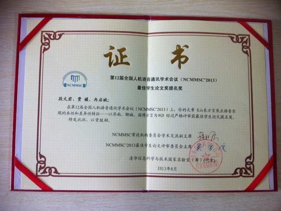 2011级语言学及应用语言学研究生段文君与其指导老师合作的论文《山东方言焦点语音实现的共性和差异性特征——以济南、聊城、淄博方言为例》,在8月5-7日于贵阳举行的第十二届全国人机语音通讯会议(NCMMSC2013)上获得最佳学生论文提名奖,是此次会议3篇提名奖论文之一。