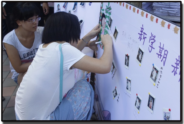 除常规注册手续外,汉院还为此次迎新活动精心设置了主题为“新学期新愿望”心愿墙。新生注册后,在志愿者的引导下,拍下了自己进入大学校门的第一张照片,随后,他们将照片贴在展板上,并写下自己初入大学的新愿望。随着最好一位新生报到结束,心愿墙上已经汇集了26位同学自信、灿烂的笑容和对未来满满的憧憬与希冀。