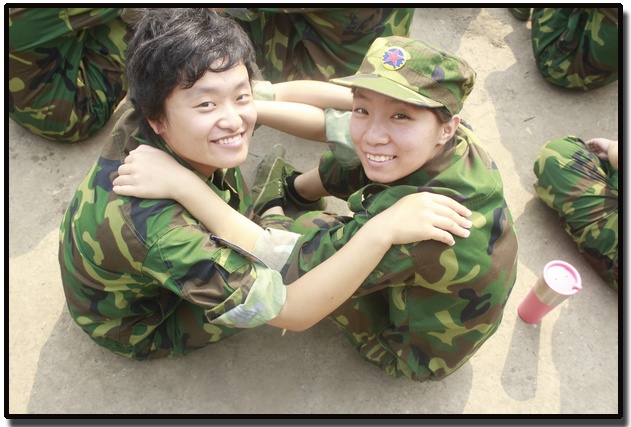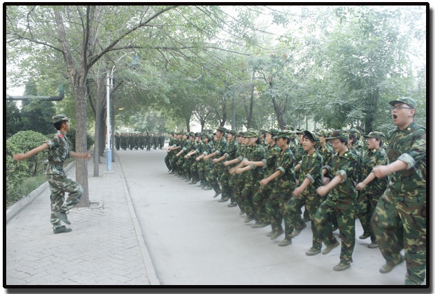还未到校区门口,我们就可以依稀听到操场上“1,2,3,4”的口号声,走近后发现汉院的新生们正在队伍里练习齐步走、向右看等动作,一遍又一遍地练习早已让军绿色的衣服湿透,但是大家仍然一丝不苟地完成着动作。有时会有人做错动作,但是大家会相视一笑,继续投入艰苦的训练中去。