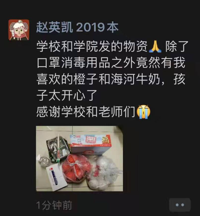 目前在津南校区自我居家隔离的2020级研究生刘诗文在收到慰问品后说道:“空荡荡的宿舍变成了营养的储备仓。牛奶、橙子、梨、元和西饼、餐具、口罩、消毒凝胶……看着邵书记和孙伟老师拎着大包小裹站在宿舍门口,当所有人都害怕走进津南的时候,老师们坚定地站在了我们的面前。这一刻,我突然了悟了“归属感”的含义。在南开,在汉院,我们不再是被网络攻击的隔离学生,而是被老师们宠爱的孩子,是被老师们信任的大人。”
