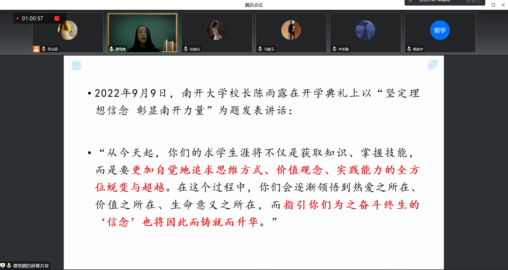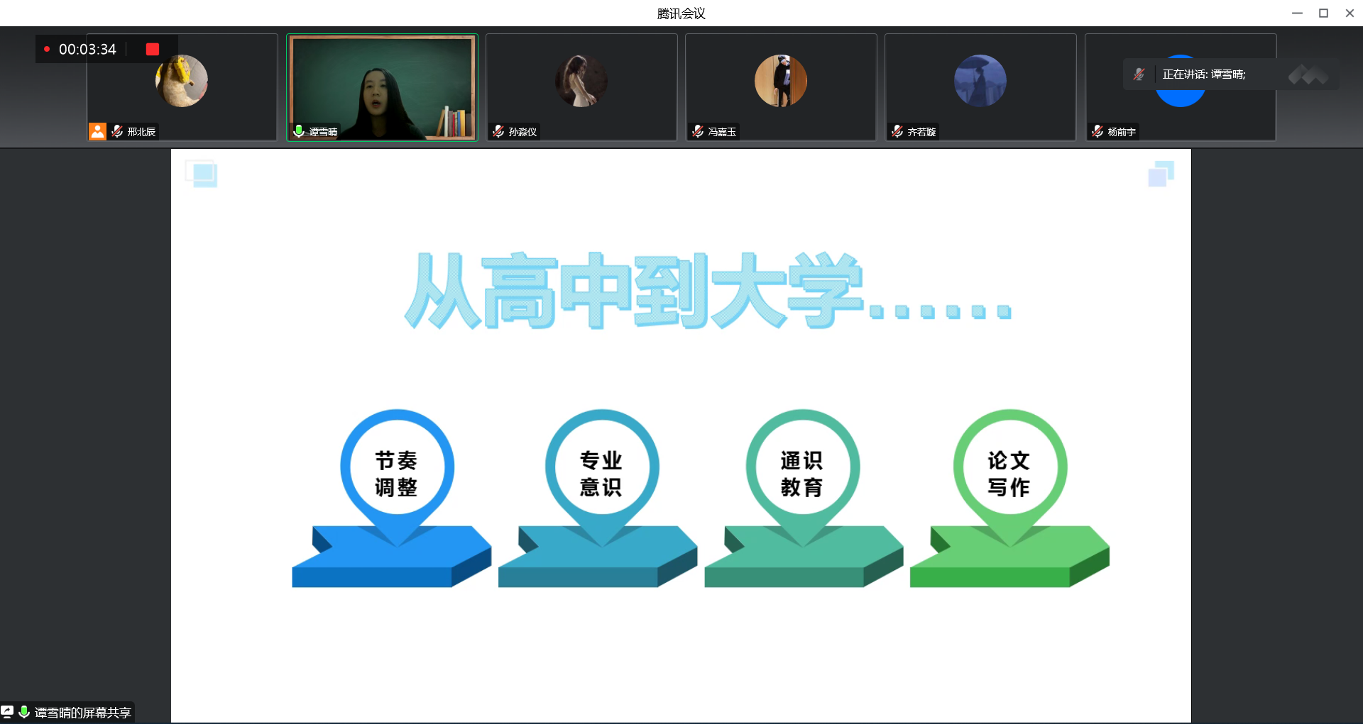 谭老师从高中与大学的不同入手,从目的性、自主性、教学模式、课程维度、学习强度、生活环境、人际交往等多角度分析二者的差异。她提出的步入大学之后“培养自主学习意识;根据目标制定计划;适应新的教学模式;合理选课;适应不同课程的授课与考核要求”的建议,让同学们受益匪浅。