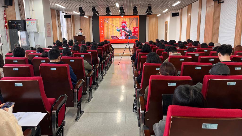 讲座中,黄齐峰还详细介绍了京剧中特有的精美服饰,他说:“京剧舞台上服装精美,样子像了,演员才能走进观众的心里。”为使大家更为直观的感受京剧的服装,黄齐峰特意邀请同学穿上武生服装进行体验,在展示服饰精美之余,黄齐峰表示:战争是冰冷的,但京剧的服装是精美的,这说明中国人心中是对和平非常向往的,我们是热爱和平的民族。讲座最后,黄齐峰带领大家学习了京剧《定军山》选段,在大家的跟唱中,讲座接近尾声。