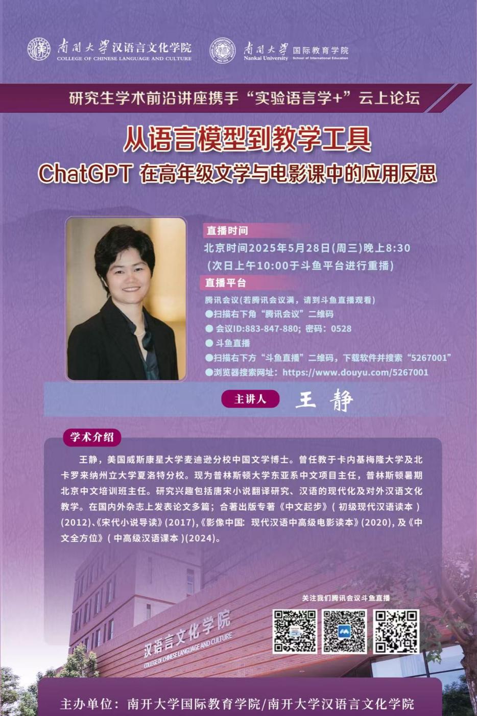 主办的研究生学术前沿讲座携手“实验语言学+”云上论坛成功举行。本次讲座特邀美国普林斯顿大学东亚系中文项目主任王静博士担任主讲,主题聚焦“从语言模型到教学工具:ChatGPT在高年级文学与电影课中的应用反思”。讲座由色情免费